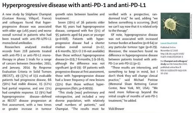最近一期柳葉刀雜志發(fā)表評(píng)論文章,法國研究人員Champiat等發(fā)現(xiàn)大于65歲的病患接受PD-1/PD-L1單抗治療過程中出現(xiàn)腫瘤的超快進(jìn)展現(xiàn)象,而且總體生存率也較差。