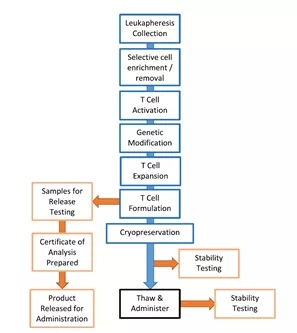 自體回輸?shù)腃AR-T制備工藝經(jīng)過(guò):T細(xì)胞采集及儲(chǔ)存-T細(xì)胞的富集-T細(xì)胞激活-T細(xì)胞轉(zhuǎn)導(dǎo)修飾-T細(xì)胞擴(kuò)增-成品CAR-T儲(chǔ)存等。質(zhì)量控制和檢測(cè)環(huán)節(jié)貫穿整條工藝線。在整個(gè)工藝流程中,有幾個(gè)關(guān)鍵環(huán)節(jié)和關(guān)鍵指標(biāo)需要注意。以下分析的基礎(chǔ)為已上市的兩款CAR-T產(chǎn)品和中國(guó)食品藥品檢定研究院發(fā)布的CAR-T的生產(chǎn)考慮要點(diǎn)。