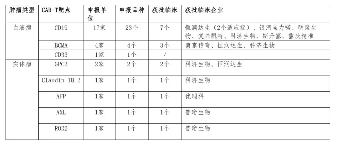 國(guó)內(nèi)無(wú)產(chǎn)品上市,大概20幾家企業(yè)申報(bào)臨床,約30個(gè)產(chǎn)品,其中11個(gè)產(chǎn)品獲批臨床,國(guó)內(nèi)CAR-T研發(fā)特點(diǎn):