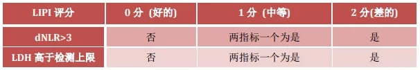 LIPI是綜合了兩個血液檢查指標(biāo):dNLR(中性粒細(xì)胞/淋巴細(xì)胞百分比)和LDH(乳酸脫氫酶)。具體的計算方法也非常簡單:如果dNLR大于3同時LDH高于檢測上限,得分是2,預(yù)后較差;如果dNLR小于3,同時LDH不高于上限,得分是0,預(yù)后較好;中間狀態(tài)得分是1,屬于中等水平。如下圖所示: