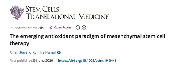 [1] Stavely, R, Nurgali, K. The emerging antioxidant paradigm of mesenchymal stem cell therapy. STEM CELLS Transl Med. 2020; 1– 24. https://doi.org/10.1002/sctm.19-0446