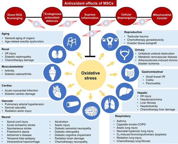間充質(zhì)干細胞的抗氧化特性包含了多種機制,包括清除自由基、促進內(nèi)源性抗氧化防御、通過抑制活性氧進行免疫調(diào)節(jié)、改變線粒體生物能量流動和向受損細胞捐贈功能性線粒體等。