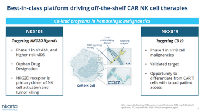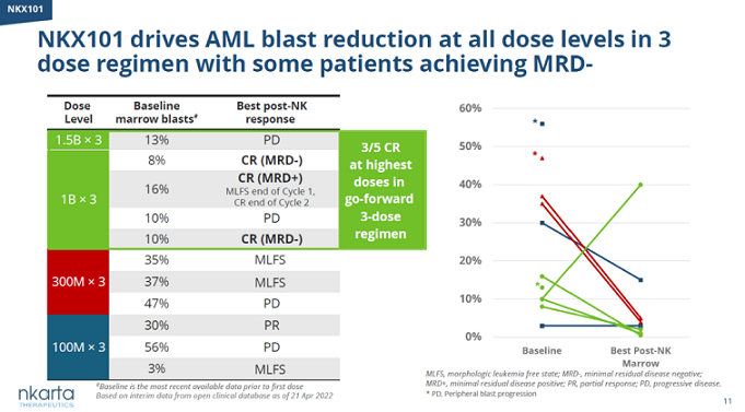 在評(píng)估NKX101治療復(fù)發(fā)/難治性急性髓系白血?。ˋML)和骨髓增生異常綜合癥(MDS)的臨床試驗(yàn)中,接受更高劑量NKX101的3劑治療方案治療的5名AML患者中3名獲得完全緩解,其中兩名患者達(dá)到最小殘余病灶(MRD)陰性標(biāo)準(zhǔn)。