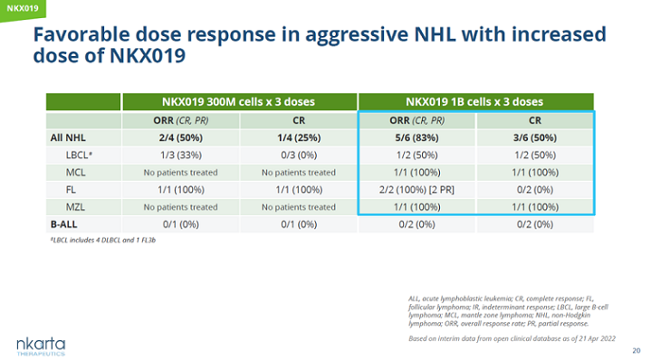 在評(píng)估NKX019治療復(fù)發(fā)/難治性B細(xì)胞癌癥的臨床試驗(yàn)中,接受更高劑量NKX019的3劑給藥方案治療的6名患者中3名患者達(dá)到完全緩解,其中包括一名彌漫性大B細(xì)胞淋巴瘤患者和一名套細(xì)胞瘤患者。