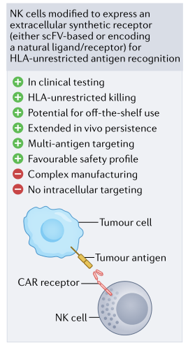 嵌合抗原受體(CARs)是一種人工合成的融合蛋白,由胞外抗原識(shí)別結(jié)構(gòu)域和胞內(nèi)信號(hào)部分組成,可觸發(fā)細(xì)胞激活。CAR工程T細(xì)胞療法是第一個(gè)出現(xiàn)的,并開(kāi)發(fā)了用于免疫腫瘤學(xué)應(yīng)用的各種產(chǎn)品。自那以后,該領(lǐng)域迅速擴(kuò)大,NK細(xì)胞也被整合到基因工程管道中。研究表明, CAR工程化NK細(xì)胞可以有效和特異性地靶向腫瘤,同時(shí)保持理想的安全性 (圖1) 。