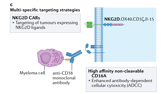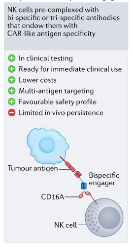NK細(xì)胞也可以通過(guò)銜接器被引導(dǎo)到腫瘤部位,通過(guò)觸發(fā)NK細(xì)胞上的激活受體,同時(shí)將靶抗原結(jié)合到腫瘤細(xì)胞上,從而引發(fā)強(qiáng)大的NK細(xì)胞介導(dǎo)的抗腫瘤反應(yīng)(圖5)。其他NK細(xì)胞銜接器策略包括三特異性和四特異性抗體設(shè)計(jì),旨在通過(guò)靶向腫瘤上的多個(gè)抗原或通過(guò)交叉連接細(xì)胞因子部分來(lái)支持NK增殖和存活來(lái)增強(qiáng)抗腫瘤效果。NK 細(xì)胞銜接器的使用繞過(guò)了工程化,不需要載體介導(dǎo)的基因轉(zhuǎn)移,因此代表了一種更簡(jiǎn)單、成本更低的制造工藝,但可以提供CAR-like活性。