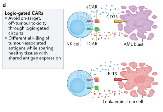 還探索了改進(jìn)CAR介導(dǎo)的激活控制的策略,特別是將靶上、腫瘤外效應(yīng)所產(chǎn)生的毒性降至最低。已經(jīng)通過(guò)使用logic-gated CAR策略來(lái)促進(jìn)選擇性靶向,被證明可以解決其中的一些問(wèn)題。在這項(xiàng)工作中,研究小組通過(guò)二價(jià)CAR靶向AML細(xì)胞上的FLT3/CD33,并使用抑制性CAR將抗原結(jié)合到健康的造血干細(xì)胞(HSCs)上,并誘導(dǎo)出‘NOT signal’以防止細(xì)胞殺傷(圖3)。