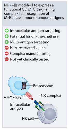 基于CAR的方法的另一個(gè)關(guān)鍵限制是,在大多數(shù)情況下,檢測(cè)能力僅限于表面蛋白質(zhì)。細(xì)胞內(nèi)抗原以多肽-人類白細(xì)胞抗原復(fù)合體的形式存在,通過(guò)TCR可以檢測(cè)到。改造NK細(xì)胞表達(dá)TCR可以檢測(cè)到這樣的多肽(圖4)。TCR引導(dǎo)的NK-92細(xì)胞最近被證明介導(dǎo)了成功的抗腫瘤反應(yīng)。雖然需要更多的研究來(lái)驗(yàn)證這種方法的臨床適用性,但一個(gè)潛在的優(yōu)勢(shì)是,因?yàn)镹K細(xì)胞不具有內(nèi)源性TCR,因而不會(huì)出現(xiàn)錯(cuò)配的問(wèn)題。然而,缺點(diǎn)是NK細(xì)胞沒(méi)有配備T細(xì)胞中的完整信號(hào)機(jī)制,從而潛在地?fù)p害了通過(guò)合成TCR有效激活的能力。