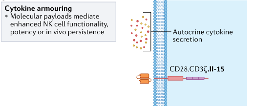 盡管這些數(shù)據(jù)有力地表明了細(xì)胞因子激發(fā)的優(yōu)勢(shì),但持續(xù)的體外刺激會(huì)使NK細(xì)胞“細(xì)胞因子成癮”,并導(dǎo)致在缺乏體內(nèi)細(xì)胞因子支持的情況下輸注這些細(xì)胞時(shí)其持久性降低。為了避免這個(gè)問(wèn)題,同時(shí)仍然利用細(xì)胞因子激活的好處,通過(guò)基因工程,NK細(xì)胞被修飾以產(chǎn)生支持細(xì)胞潛能、增殖和持久性的細(xì)胞因子(圖7)。這種自分泌細(xì)胞因子極大的引起了研究人員的興趣,CAR工程化的NK細(xì)胞為了提高其持久性也采用了攜帶補(bǔ)充細(xì)胞因子信號(hào)的基因工程化策略。由工程N(yùn)K細(xì)胞產(chǎn)生的細(xì)胞因子還可以介導(dǎo)旁觀者效應(yīng),從而激活存在于腫瘤微環(huán)境中的其他免疫效應(yīng)細(xì)胞,如T細(xì)胞或髓系細(xì)胞,從而潛在地進(jìn)一步增強(qiáng)抗腫瘤反應(yīng)。