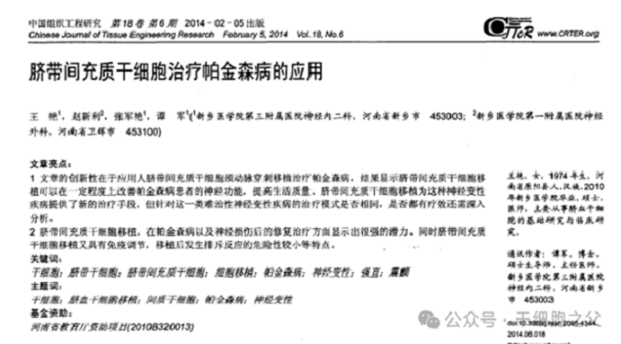 案例1:2018年,中國(guó)實(shí)用神經(jīng)疾病雜志刊登了“神經(jīng)干細(xì)胞移植治療帕金森的效果觀察”一文。文章中介紹了河南駐馬店中心醫(yī)院神經(jīng)內(nèi)二科對(duì)27例帕金森患者進(jìn)行神經(jīng)干細(xì)胞移植手術(shù)治療。